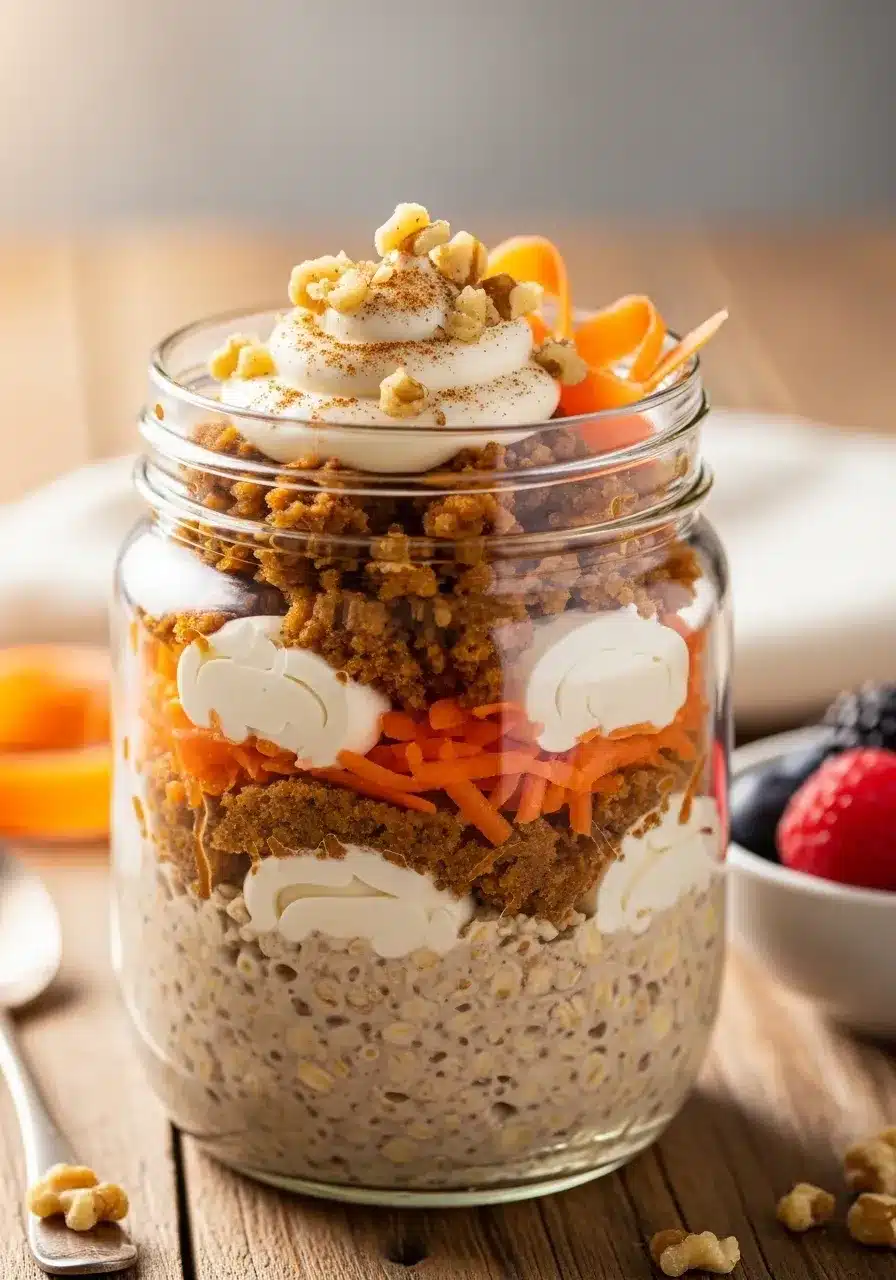 A Aveia de um dia para o outro com bolo de cenoura é também super nutritiva. A aveia fornece fibras essenciais, que ajudam na digestão e mantêm a saciedade por mais tempo. A cenoura adiciona vitaminas e um toque natural de doçura.