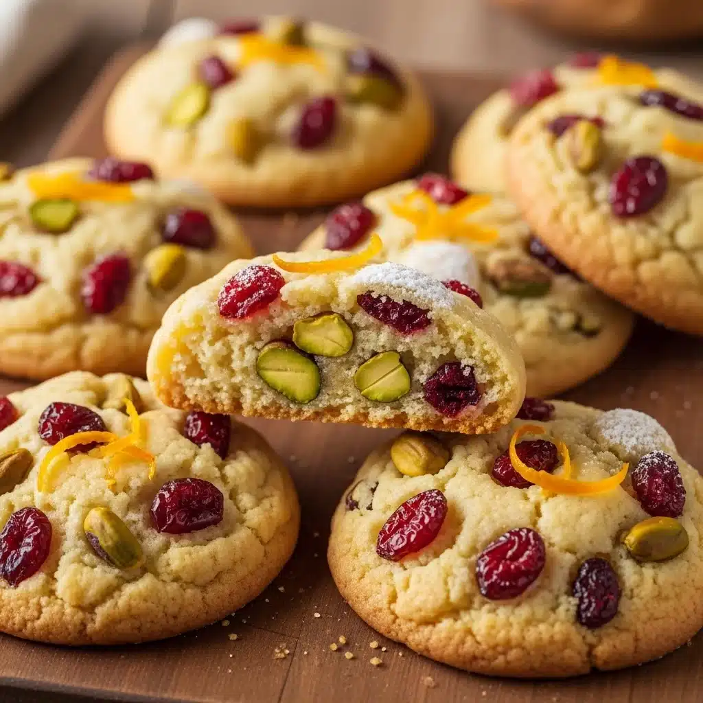 Biscoitos amanteigados com cranberries, raspas de laranja e pistaches, perfeitos para momentos em família e para acompanhar o café da tarde.