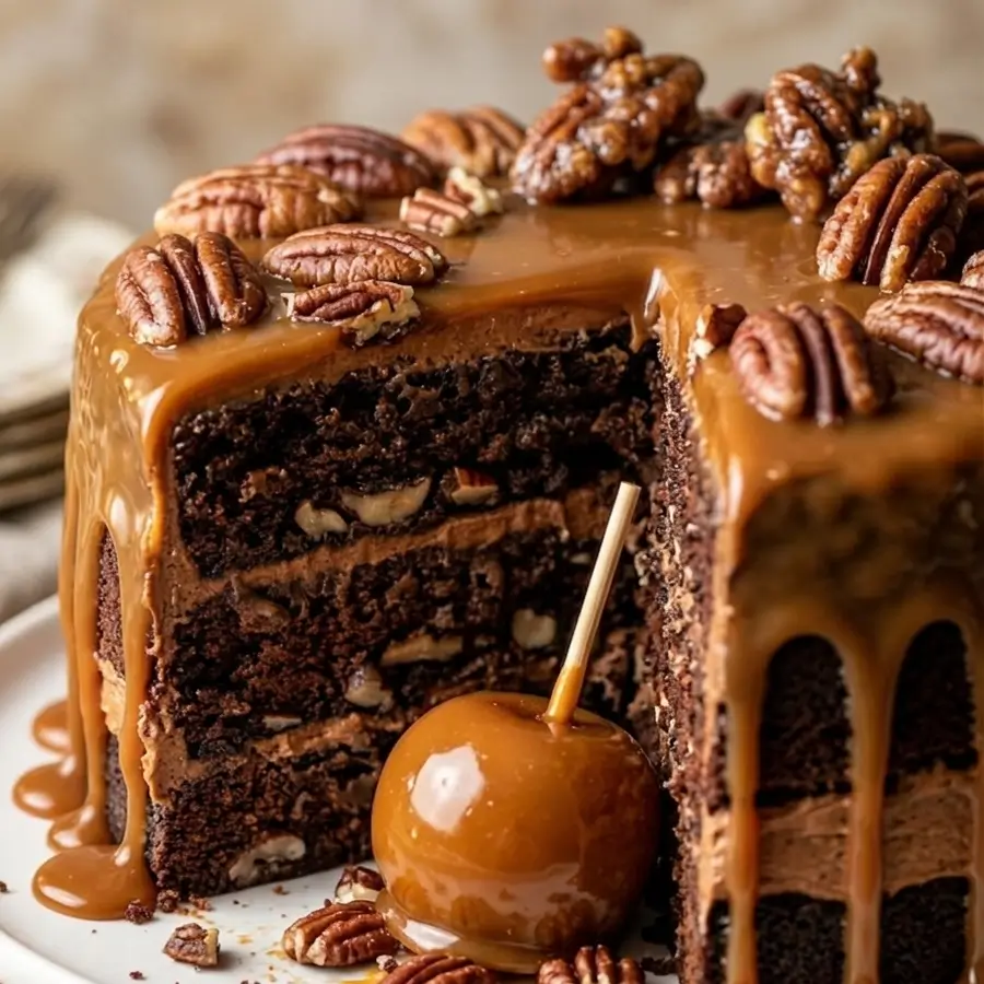 Um bolo nostálgico de caramelo com nozes, com um padrão de caramelo e nozes que lembra o casco de uma tartaruga, perfeito para encontros familiares.