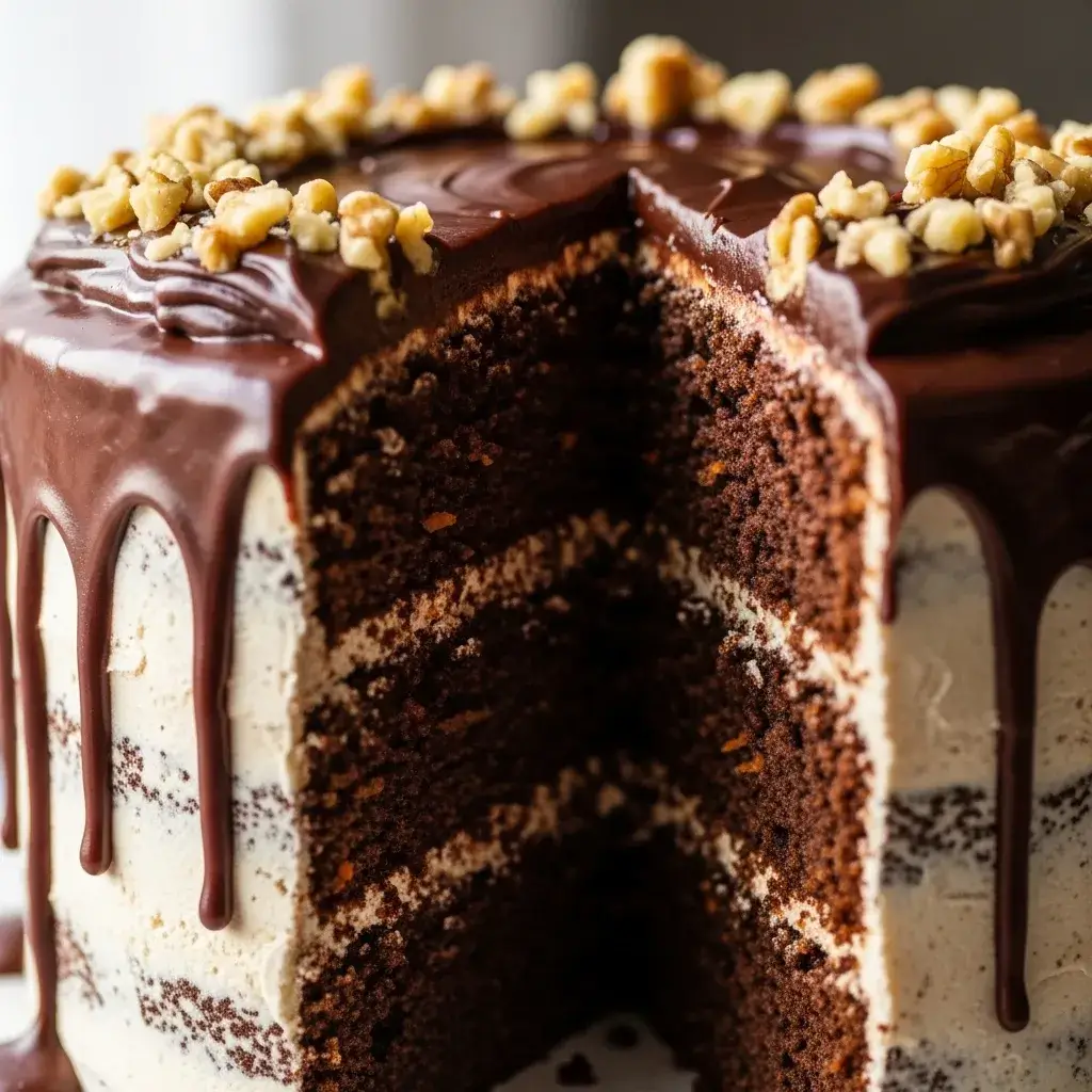 Um bolo de cenoura fofinho com efeito mesclado de chocolate, combinando dois sabores clássicos em uma sobremesa irresistível.