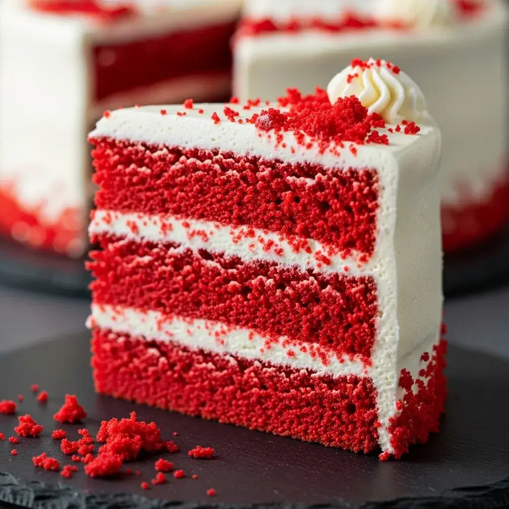 Um clássico bolo Red Velvet, macio, aveludado e com sabor delicado de chocolate, coberto com um creme suave e irresistível.