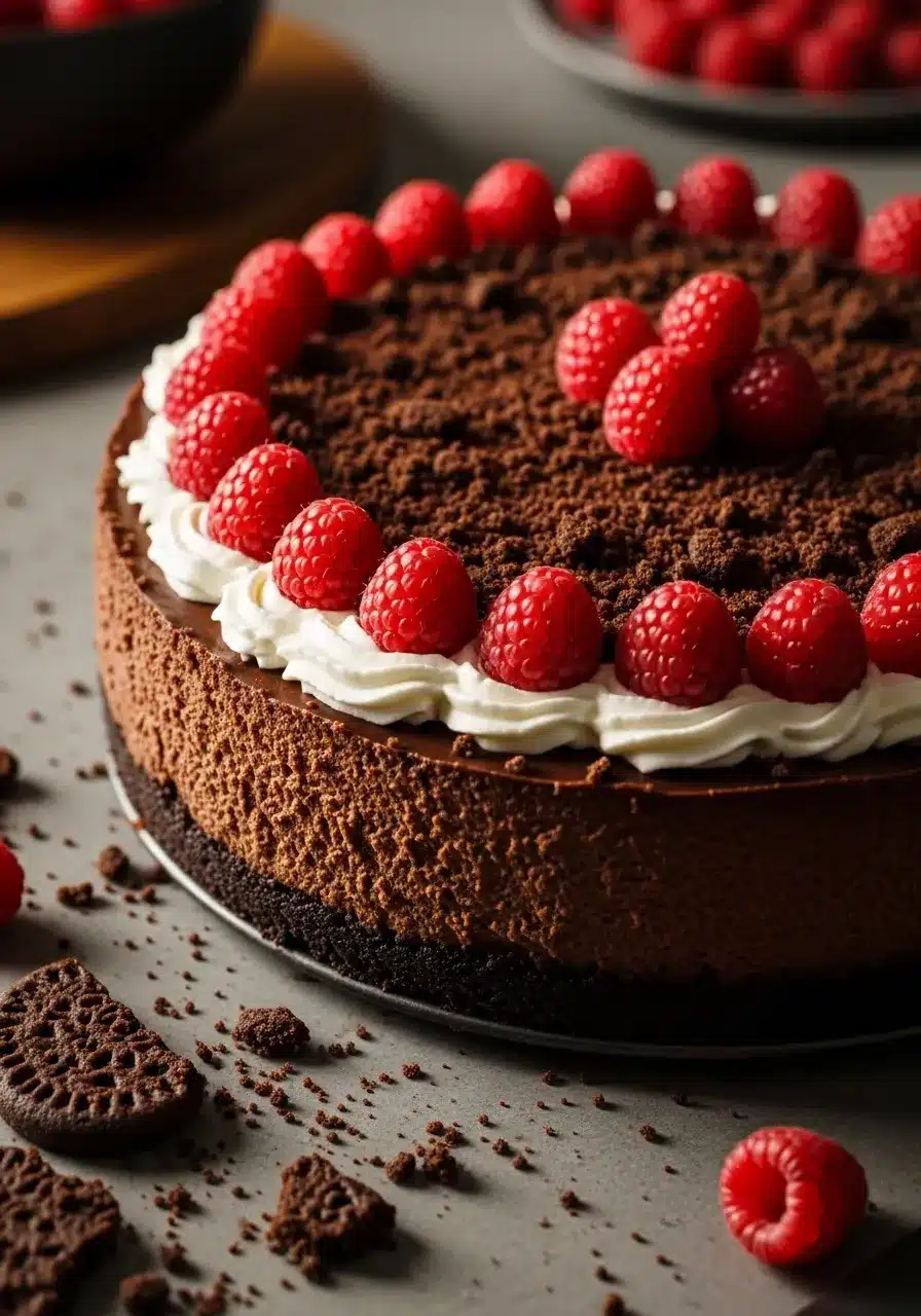 Para a base, biscoitos de chocolate, como Oreo sem o recheio, triturados, dão um toque diferente e igualmente delicioso. Se quiser uma variação ainda mais indulgente, adicione raspas de laranja ao recheio do Cheesecake de chocolate amargo com framboesa ou experimente uma calda de frutas vermelhas mistas em vez de apenas framboesa. Use a criatividade!