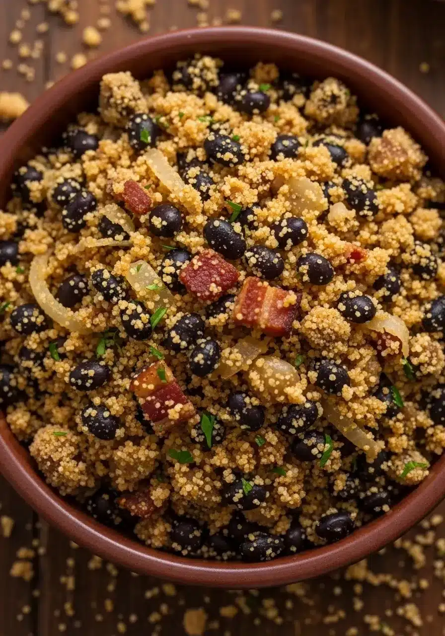 Foi nesse dia que resgatei uma receita antiga da minha avó, um verdadeiro tesouro culinário: a farofa de feijão. Um cheirinho de alho e cebola refogando, o barulhinho do bacon fritando… e logo a cozinha se transformou em um abraço. Meus filhos, que muitas vezes torcem o nariz para o feijão puro, devoraram a farofa de feijão com um brilho nos olhos.