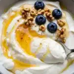 Receita de iogurte grego caseiro, nutritivo e econômico, feito com ingredientes naturais para evitar aditivos e açúcares. Ideal para café da manhã, lanches, molhos e sobremesas, é fácil de fazer e promove a saúde intestinal.