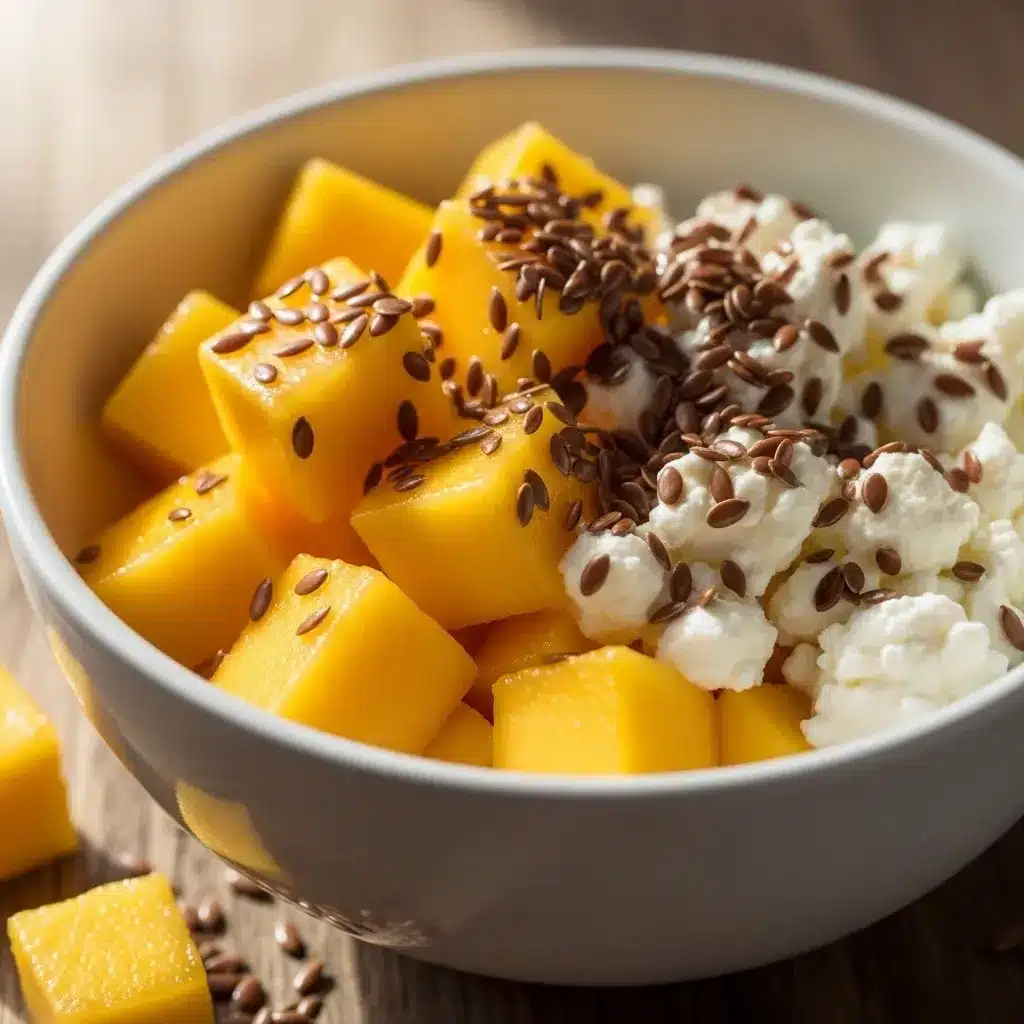 A quick, nutritious breakfast or snack featuring ripe mango, creamy cottage cheese, and crunchy golden flaxseed. This simple combination provides natural sweetness, protein, and healthy fats in under 5 minutes.