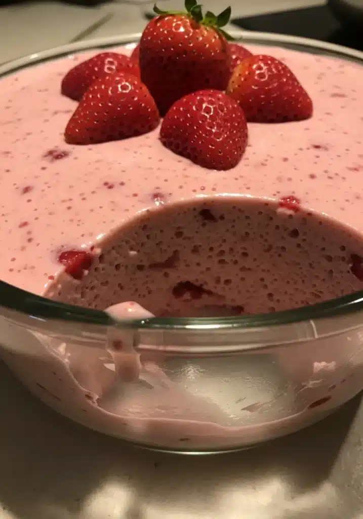 5. Despeje nas taças: Despeje a mistura da mousse de morango em taças individuais ou em um refratário grande.