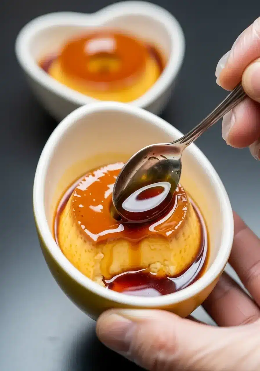 A combinação de quente e frio, crocante e cremoso, é divina. Uma calda de frutas vermelhas fresca também pode adicionar um toque de acidez. Isso quebra um pouco a doçura e realça os sabores do seu Ovo de Páscoa de Pudim.
