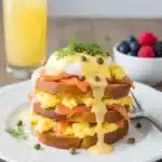 - Monte seus Ovos à Napoleão: Coloque uma fatia de pão torrado em cada prato. Por cima, adicione um ovo pochê bem escorrido. Regue generosamente com o molho holandês cremoso. Finalize com cebolinha picada e pimenta do reino moída na hora. Sirva imediatamente e celebre seu Ovos à Napoleão para um Brunch Fácil!