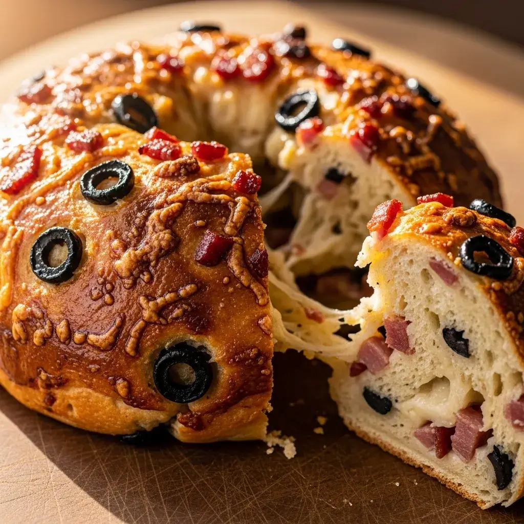 Um pão caseiro macio e saboroso, recheado com azeitonas, bacon crocante e queijo derretido, perfeito para servir como lanche ou acompanhamento.