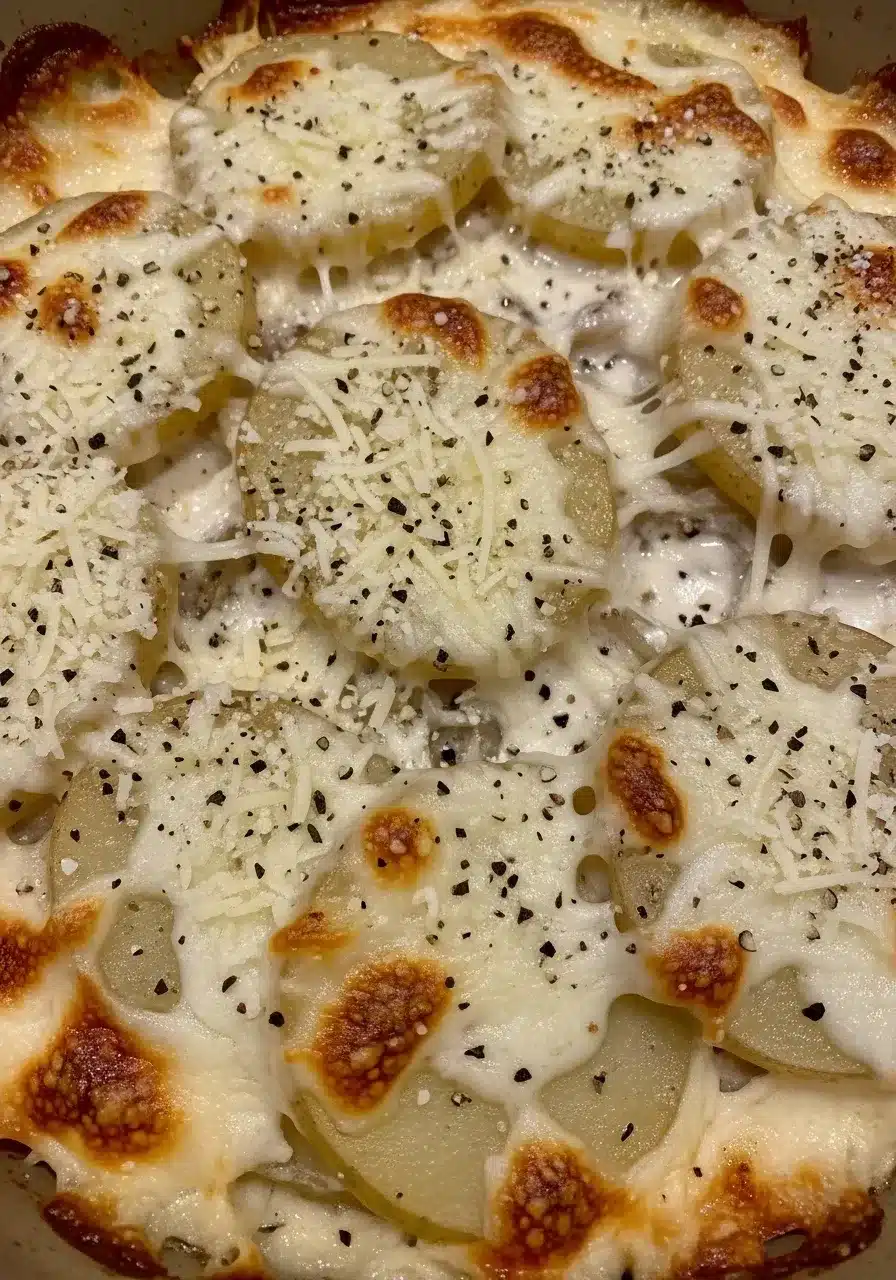 This creamy and golden potato gratin with cheese is a classic comfort food, reminiscent of home and family gatherings. Easy to make and incredibly versatile, it can be served as a side dish or a light main course. The combination of tender potatoes, melted cheese, and a rich béchamel sauce makes it an irresistible crowd-plepleaser that evokes warmth and affection.