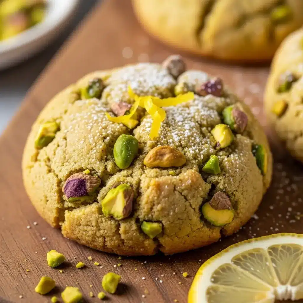 Biscoitos amanteigados de pistache e limão, com uma casca crocante e um interior macio, apresentando o equilíbrio perfeito entre a acidez cítrica e o sabor rico da manteiga com pistaches crocantes.
