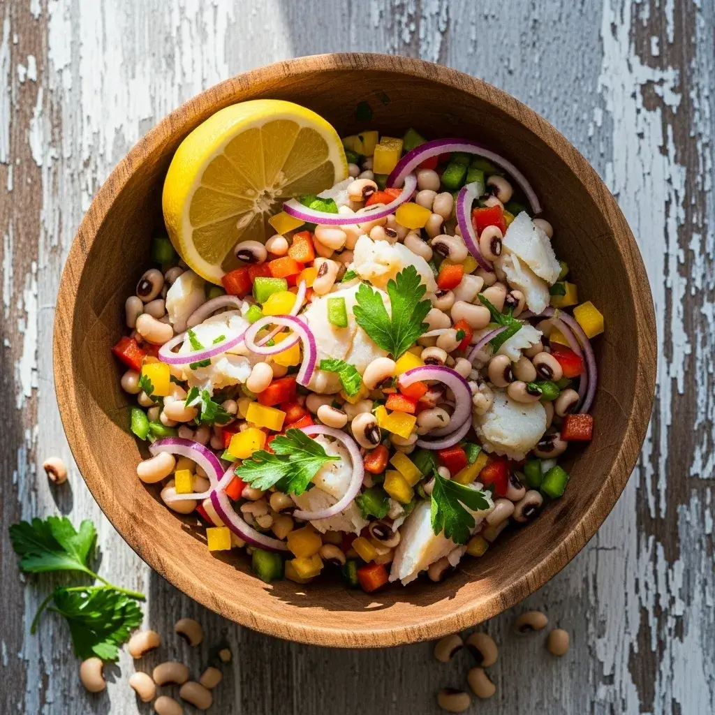 Salada refrescante e nutritiva de feijão fradinho com bacalhau desfiado, temperada com azeite, legumes e ervas, perfeita como prato principal leve ou acompanhamento.