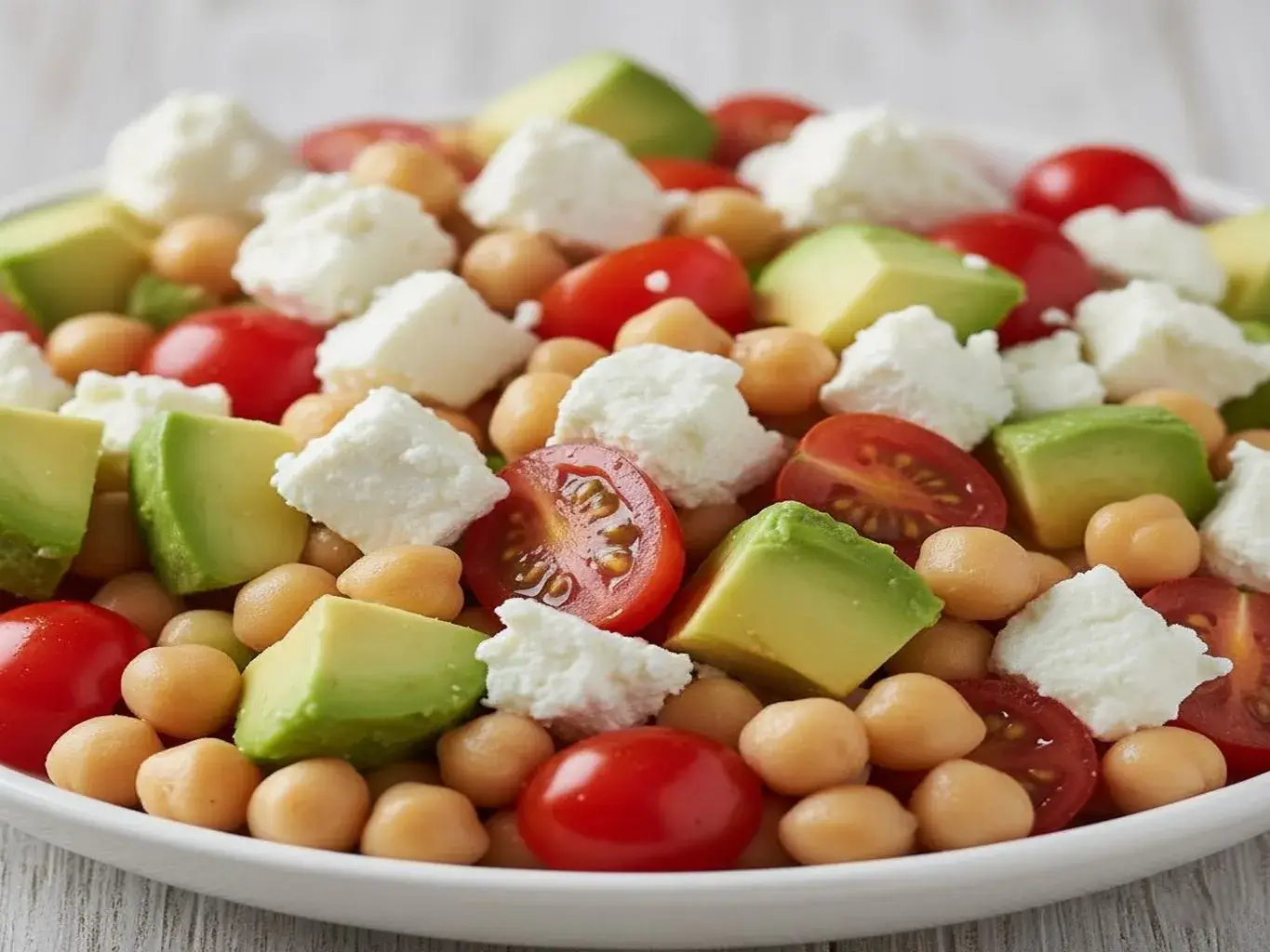 Uma salada fresca e nutritiva com grão-de-bico, queijo feta e abacate, perfeita como prato principal leve ou acompanhamento em dias quentes.