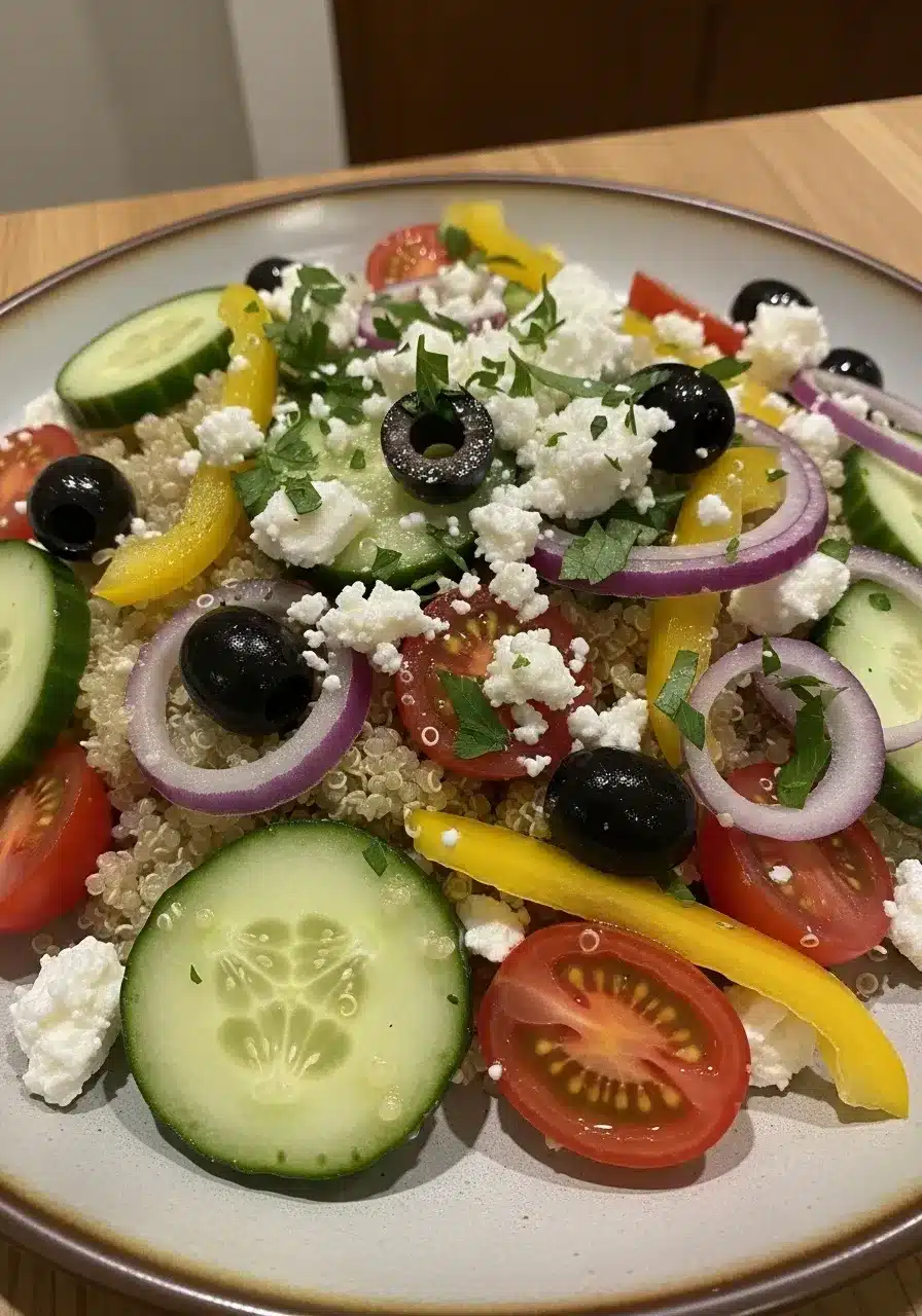 A Salada Mediterrânica de Quinoa é rica em proteínas vegetais completas (a quinoa contém todos os aminoácidos essenciais), fibras, vitaminas e minerais. Ela ajuda na digestão, promove a saciedade e contribui para a saúde cardiovascular, tornando esta Salada Mediterrânica de Quinoa uma opção muito saudável.