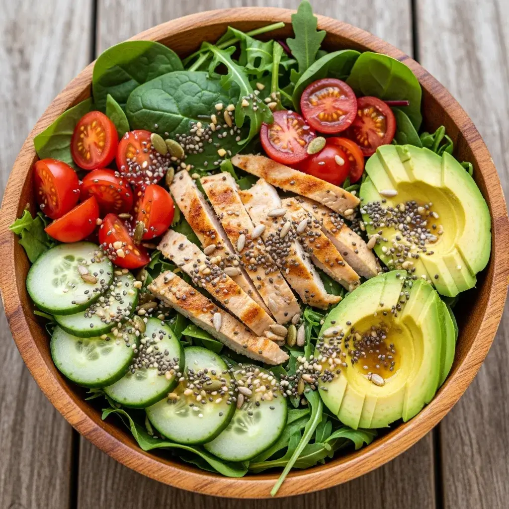 Uma salada saudável, completa e rica em proteínas, feita com frango grelhado, legumes frescos e um molho leve, ideal para refeições equilibradas.