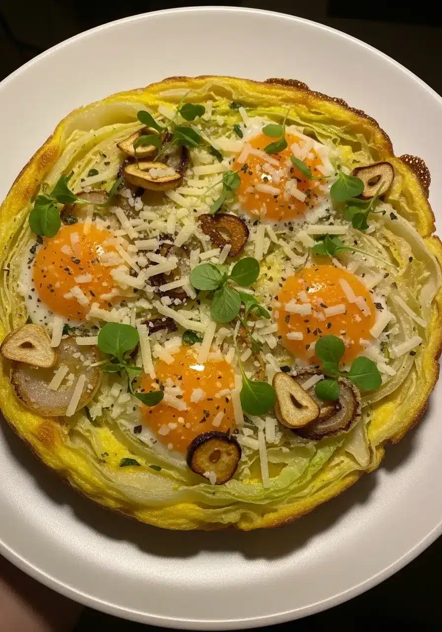 - Finalize: To brown the top of your Skillet Cabbage Pie, you have two options: (1) On the Stove: Carefully use a large plate or lid to flip the pie. Return it to the skillet and cook the other side for another 5 to 7 minutes, until golden. (2) In the Oven (if your skillet is oven-safe): If your skillet is suitable for the oven, sprinkle extra Parmesan cheese on top and bake in a preheated oven at 180°C for 10 to 15 minutes, or until golden and the cheese melts